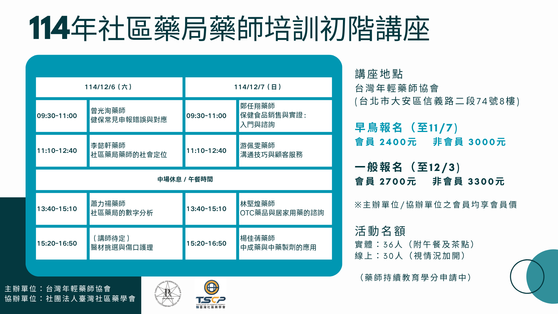 實體36人(附午餐及茶點,額滿為止)|線上30人(視情況加開)
