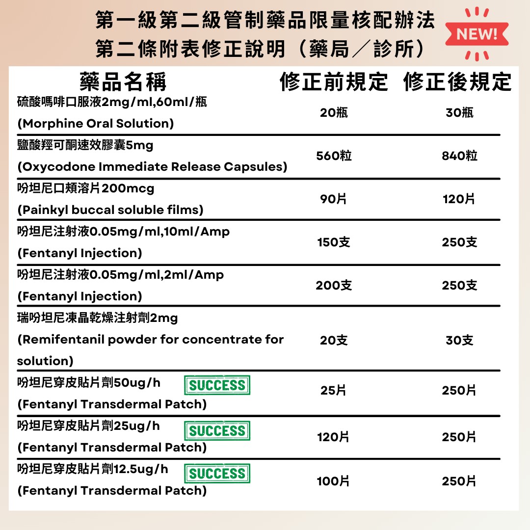 針對藥局、診所有包含 Morphine solution、Oxycodone 5mg、Painkyl 200mg、Fentanyl 12.5/25/50 貼片、Fentanyl 注射液 10ml & 2ml 等品項年限量均有上調。